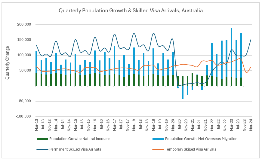 - There was also a total of 61,090 Temporary Skilled Visa arrivals for the March 2024 quarter which is 5% lower than March 2020 quarter, and around 9% higher than the decade average prior to COVID.